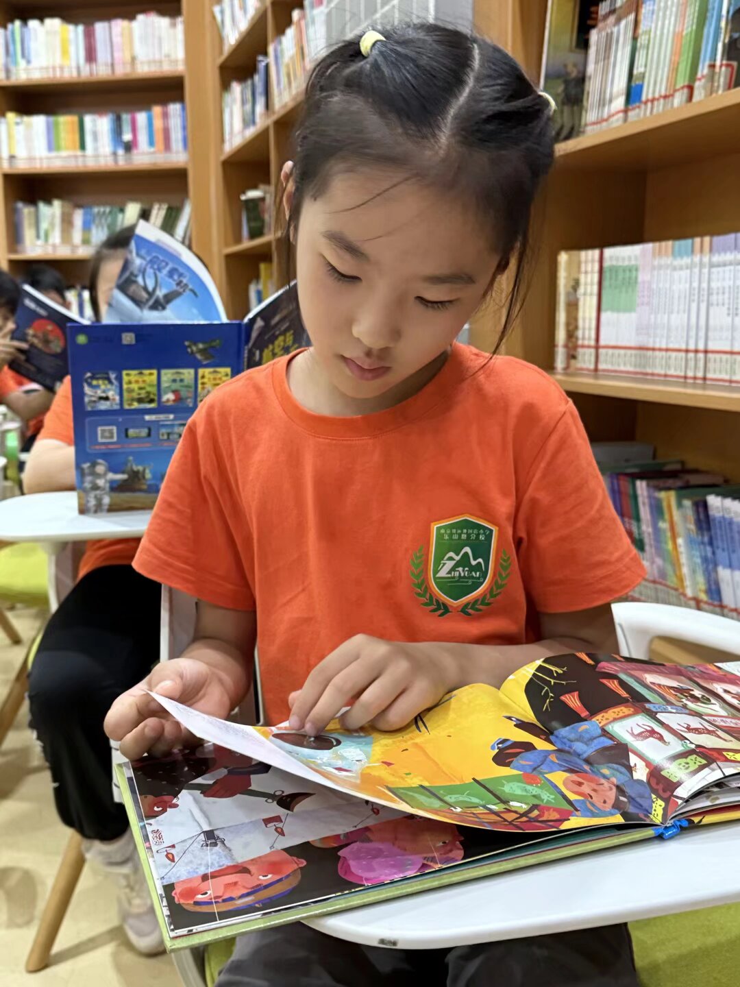 阳光被高大的玻璃窗滤过,变得温柔而澄澈,轻轻铺洒在图书馆的原木书桌上。孩子们散落在各处,仿佛被书籍施了定身的魔法。靠窗的女孩整个人陷在豆袋沙发里,膝盖上摊开一本《柳林风声》。她一动不动,只有手指偶尔轻轻摩挲着插图上河鼠和小鼹鼠划船的画面。阳光在她微微卷曲的发梢跳跃,她却浑然不觉,完全沉浸在杨柳岸边的微风里。不远处,两个男孩头挨着头,趴在一本摊开的《国家地理少